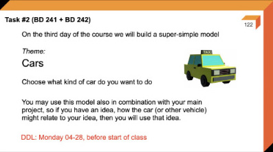 Looking for a simple and fun model subject, I thought of cars, as they can be done with a simple boxy design and include also round elements (the wheels).